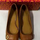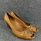 Tory Burch Designer Brown Pebbled Leather Gold Logo Peep Toe Wedge Heels Sz 6.5